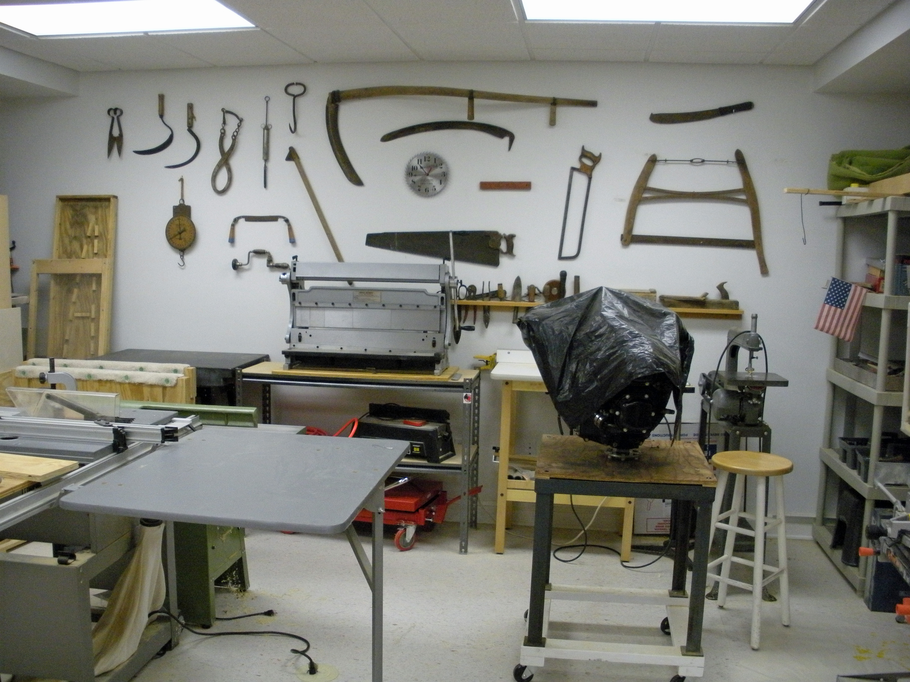 spray booth along one wall over the exhaust vent, a router table, a metal shear/brake/roller from Harbor Freight, a floor jointer,